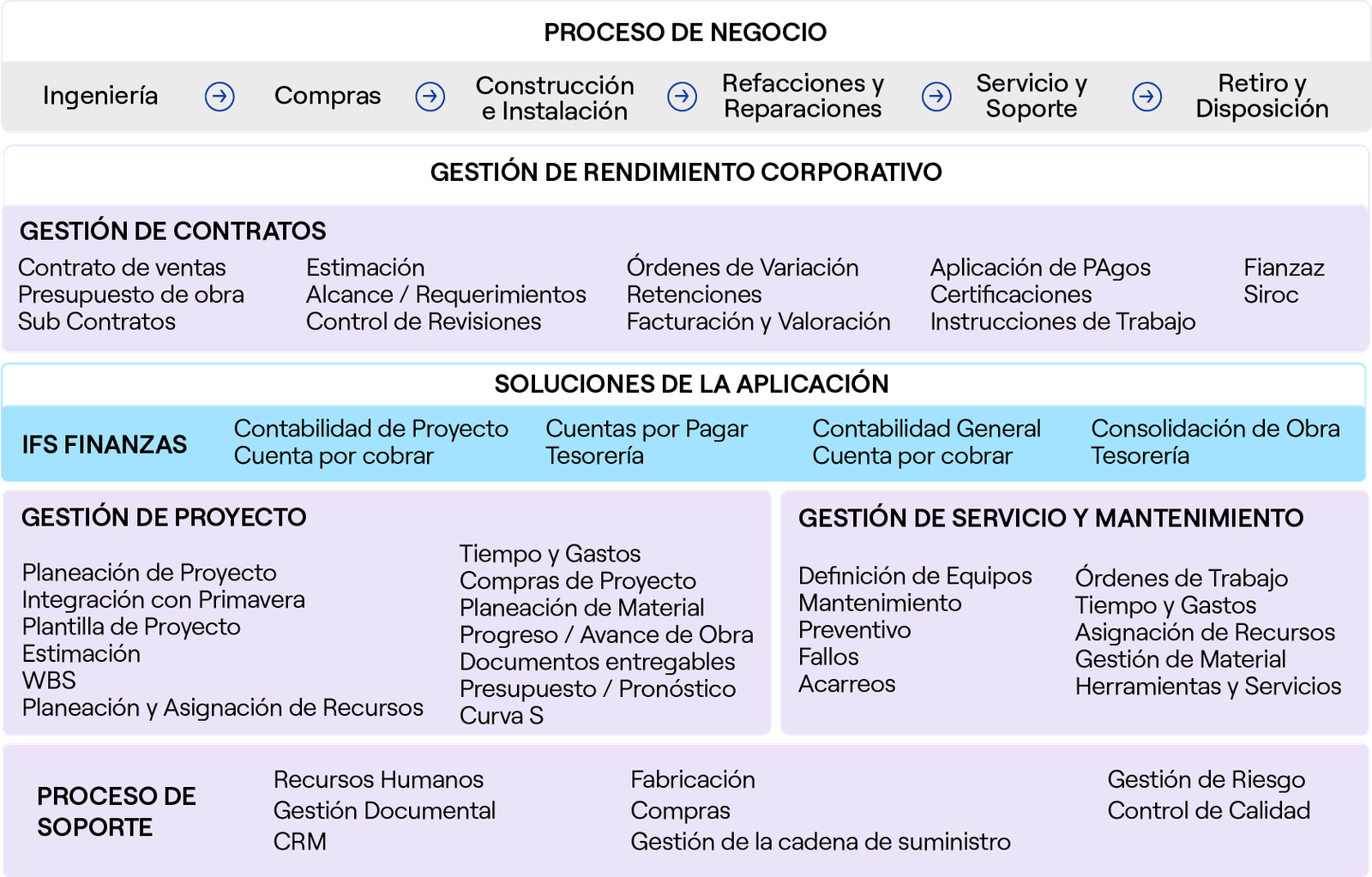IFS nos permite incorporar controles de ejecución de obra, de control de calidad, gestión de riesgos, registro de la producción, etc. que le permita reducir significativamente el tiempo, el costo y la complejidad.
